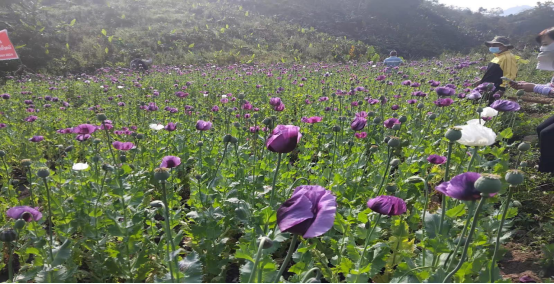 每年2月是罂粟花期最盛时期,罂粟地开满鲜艳的花朵,部分罂粟苗还在稚嫩的成长抽蕾阶段,还有一部分植株已经挂上核桃大小的绿色果实。