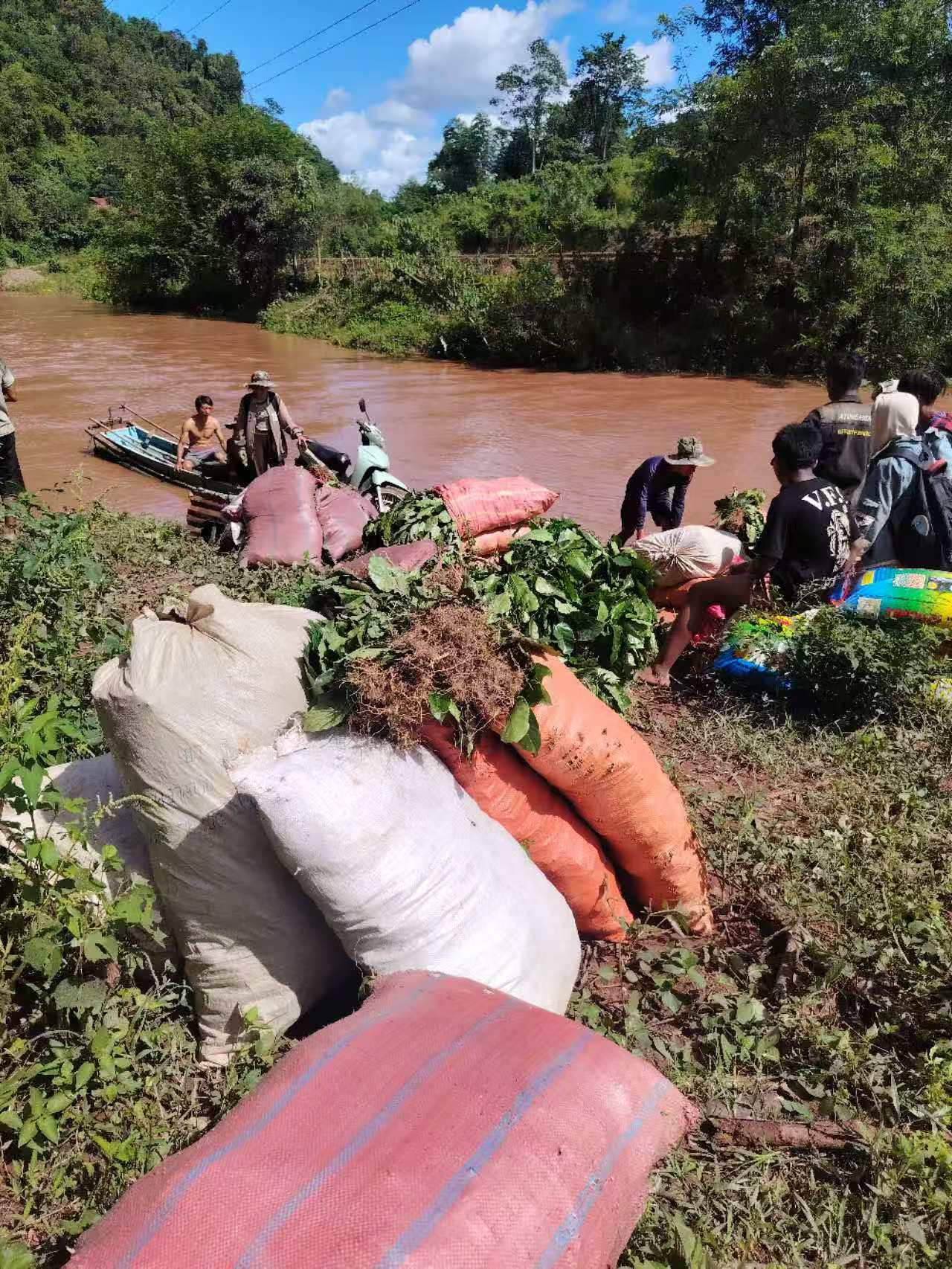 抵达勐迈县后,鉴于羊代村地理位置独特、交通不便,只能通过水路继续运输咖啡苗。工作人员格外小心地将咖啡苗搬运至船上,随后船只沿着水路平稳行进,最终成功将咖啡苗送至羊代村。
