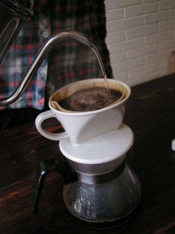 6. 闷蒸.闷蒸的目的是为了闷出咖啡的香味,为第二次冲泡做好准备.闷蒸的水温应该为93度,从豆粉中央注水,绕圆2-3圈,使全部全部豆粉都能均匀吸水,水滴下滴3-5滴为最好.豆粉吸水以后会膨胀,由之前的平整变为往上凸起的圆弧型.这时可以闻到咖啡粉散发出的淡淡香醇味道.这个步骤是决定一杯咖啡冲泡是否成功的决定性因素之一,尤其重要.