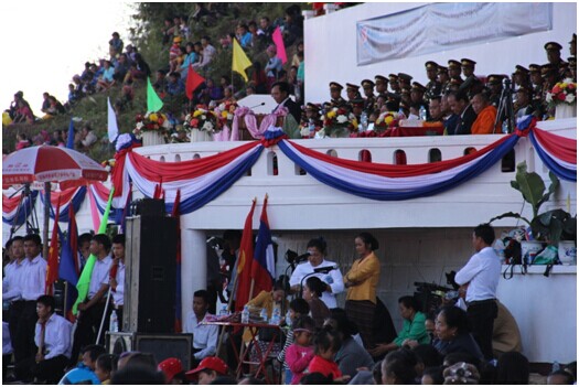 28日下午四点,庆典开幕仪式开始,场面颇为壮观。由小学生身着校服进场开始,老挝政府部门人员身着各自部门制服,各民族代表也身着五颜六色的民族服饰一一进场参加庆典。进场仪式结束后,丰沙里省省长坎建发表了讲话。
